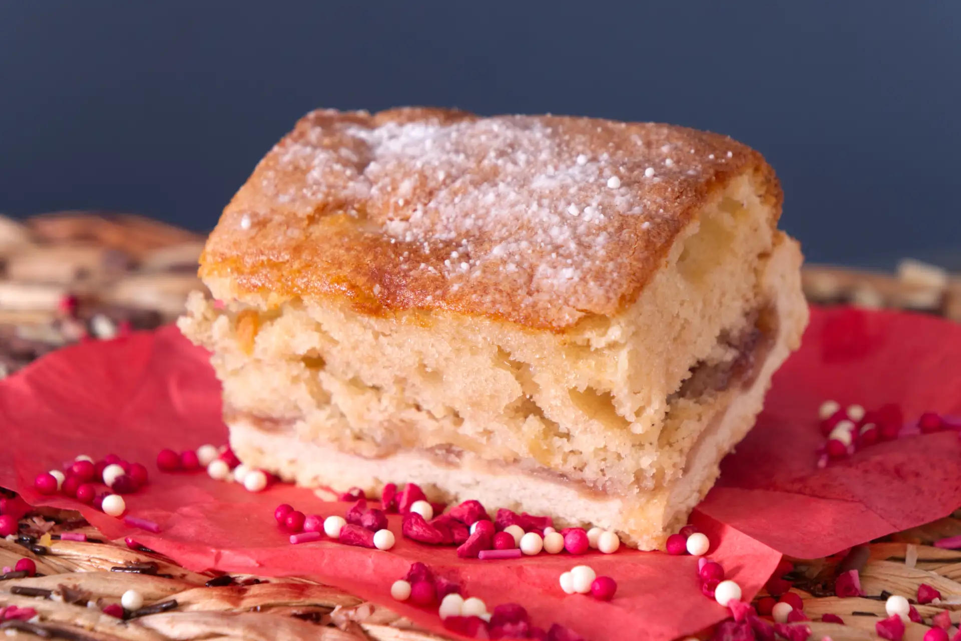 Wheat flour, raising agent, Egg, Milk, Butter, Flavouring, fresh apples,cinnamon, strawberry jam